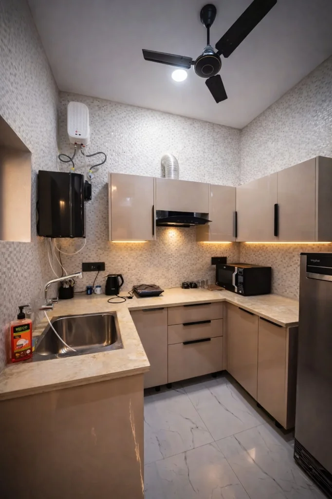 Book NowSpanning 700 sq ft, the Family Suite is designed for families or small groups. Both bedrooms come with attached washrooms, ensuring comfort and privacy for all guests. The suite also includes a fully equipped kitchen and a dedicated living room, making it perfect for shared meals, relaxed conversations, and longer stays.